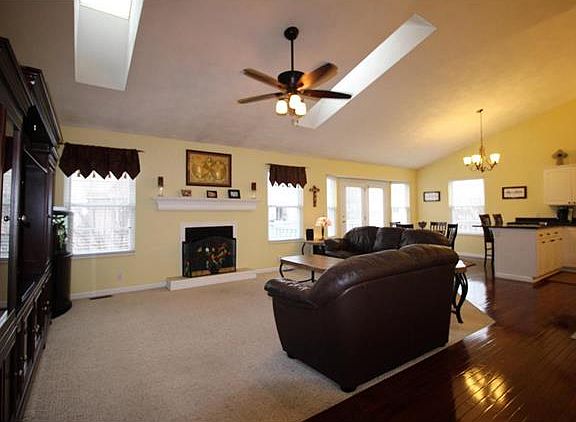 WONDERFUL 4 Bedroom Ranch w/ Finished Walk-Out Lower Level in Deerfield neighborhood! Greeted by covered front porch. Upon entry into foyer w/ vaulted ceiling & coat closet. Dining room to right w/ plant shelf & front window. Through foyer, awesome Open Floorplan awaits w/ Great Room w/ vaulted ceiling, 2 skylights & Gas Ventless fireplace. Great Room open to Upgraded Kitchen w/ Granite Counters, white cabinetry w/ oil rubbed bronze pulls, Stainless dishwasher, gas burner cooktop, microwave, oven; refrigerator & pantry closet. Breakfast area w/ double doors & bay window provide much natural light. Master Bedroom Suite w/ double door entry, vaulted ceiling, large bay window, walk-in closet, dual vanities w/ Granite counters, stand up shower, jacuzzi jetted tub & linen storage. Three additional bedrooms, full bath & laundry room on main. Finished Owens Corning Lower Level, walk-out w/ daylight windows! Large storage area & Wrap-Around Deck. New Roof in 2012. Pool Table & Bar can stay!