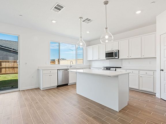 Introducing a stunning 5 bedroom, 3 bathroom home with over 2,500 square feet, in the desirable Clovis Unified School District! This brand new house features a spacious family room, quartz counter tops, kitchen island and pantry, stainless steel appliances, and stunning plank style flooring throughout. With 1 bedroom and bath conveniently located downstairs, this home offers flexibility and convenience. The spacious main bedroom suite boasts a large walk-in closet for ample storage, and ensuite bath with dual vanities and quartz countertops. Additionally, this home comes equipped with solar panels for energy efficiency. 2 Car garage!