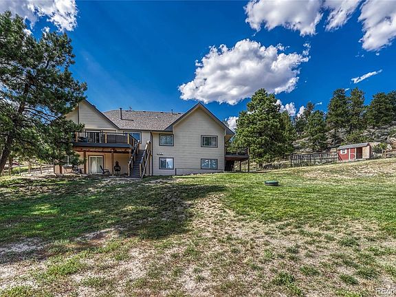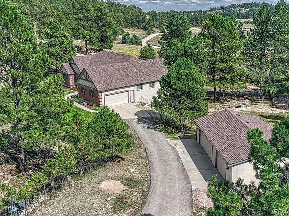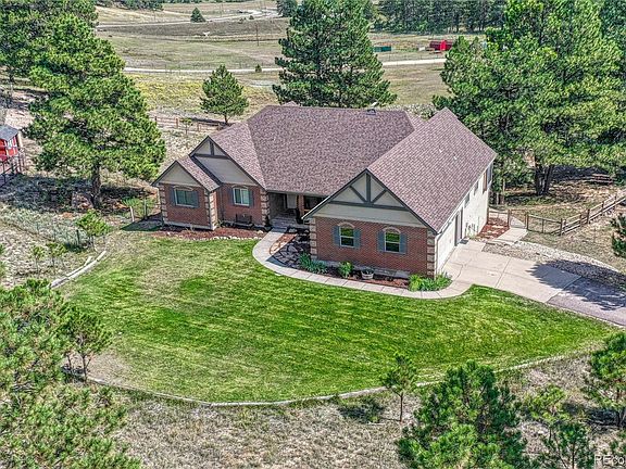 This property is truly a slice of Colorado heaven - a 5 bedroom ranch home with finished walk-out basement nestled on over 6 acres complete with pasture, trees, rock croppings, pond & a manicured front yard. YES - all of these features on one piece of property! I'm not sure who will love this home more - you or your livestock, hopefully both! The main level of the home features a primary bedroom with dedicated bathroom & walk-in closet - it has access to a private exterior trex deck, as well as a separate dedicated office space. There are two secondary bedrooms and a hallway bathroom upstairs, all conveniently on the east side of the home. The main level also features new rustic wood plank tile floors, powder room, dining room, living room with dual fireplace shared with the updated eat-in kitchen (hardwood floors newly refinished) complete with breakfast nook, bonus space perfect to enjoy your morning coffee in front of the fire and sliding glass doors that take you out to the new trex deck where you can overlook your fenced pasture while watching amazing sun rises! You'll love the new plush carpet as you go down to the finished walk-out basement which in addition to an oversized bonus/family room has a dedicated exercise room, two bedrooms, 3/4 bathroom and oversized unfinished storage space! Now ... if you've ever wanted some goats & chickens, this is the property for you (sorry - goats not included)! The walk-in chicken coop with attached run is included and you'll love filling the fully fenced pasture with your livestock of choice. There is also an inner fence that encloses the immediate back yard so the dogs (and kids) can have their own outdoor space complete with a retention pond ready for you to take to the next level! PLUS in addition to the 2 car attached garage there is a 3 card detached garage! 30 minutes to Castle Rock, 30 minutes to Monument, 20 minutes to Elizabeth - this home is just far enough to be remote yet close enough to get to what you need!
