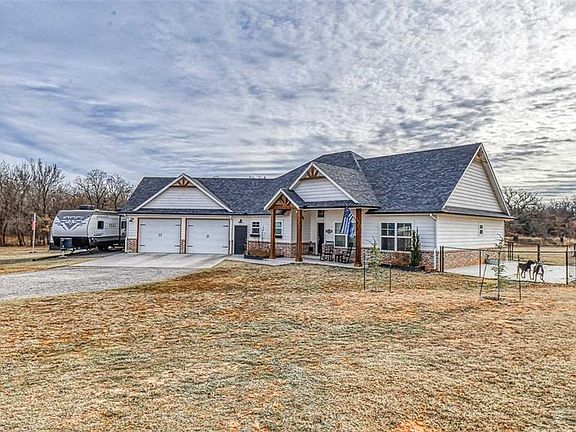 If you are looking for a peaceful location not far from town this is it! This newly built home has it all. All of the modern farm house features are so tastefully done. Beautiful tile (looks like wood flooring) throughout the majority of the home only carpet in the bed rooms. Nice open living concept with a eat up bar and farm house sink with a nice pantry. Wonderful features also include a home office, powder bath, good size laundry/mud room! The garage is deep enough for a large pick up and you also have a 22x24 shop with a concert floor. Plenty of room for RV parking with a 220 Hook up on the 2.38 acres along with a dog run and an above ground saltwater pool with a wood deck! The attic storage has decking which is weight enforced it was intended to be an upstairs room. The lot is triangle shaped. Great home for entertaining and to enjoy some amazing Oklahoma sun sets.! You do not want to miss this one!!