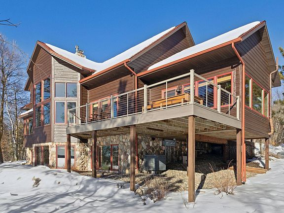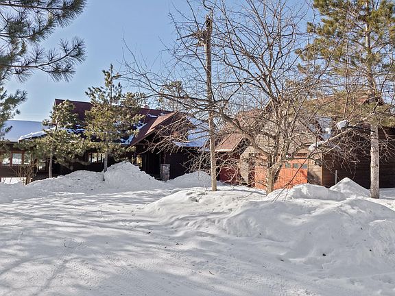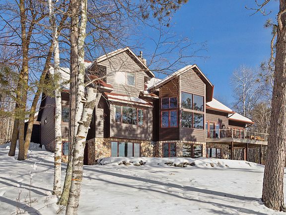 Secluded paradise on Big Mantrap Lake. This spectacular home sits like an eagle’s nest on 8.45 acres and more than 300 feet of shoreline with breathtaking panoramic views. The vaulted great room features floor to ceiling windows, living room with massive custom stone wood burning fireplace, large gourmet kitchen with high-end appliances, granite countertops, and custom cabinetry. The dining room has an antler chandelier and access to the lakeside deck. The cozy sunroom has windows on three sides. The main level suite has a large private bath with jetted tub, separate shower, and walk-in closet. The second level is a large loft area.