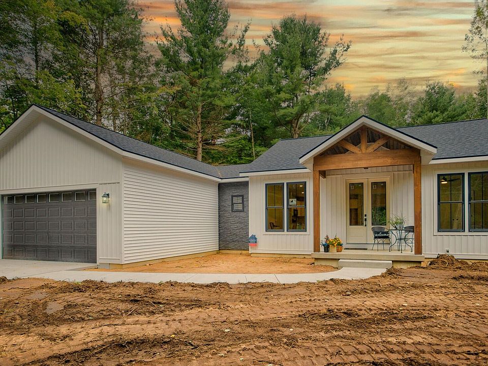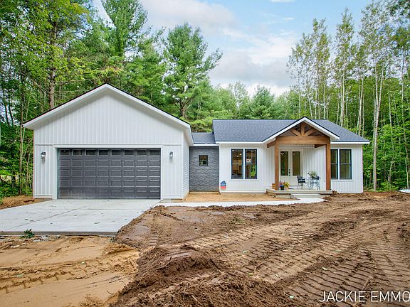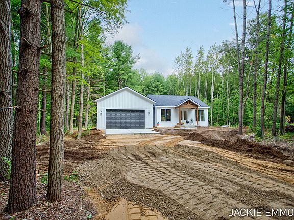 WOW!! NEW CUSTOM BUILT HOME is ''SPECTACTULAR!'' Nice Retro Feel, Soothing Colors, all the NEW LOOK in a peaceful setting. Home looks small from the front side, but its big on the inside!! With nice BIG WINDOWS and FRONT ENTRY to let the natural light in, this 3 bedroom, 2-1/2 home sits on one acre of nice wooded land, back from the road, secluded, yet convenient. With great features all on the main level: mudroom, laundry, pantry, the 1/2 bath is close to garage entrance for convenience. Full unfinished basement with egress windows, and insulated walls. Approx. 2 miles from 131 freeway on/off ramp, 1 mile from Tri County Schools, and walking distance to Little White Fish Lake Boat Launch, and the popular Pilgrim's Run Golf course is mere minutes away. Photo's represent color, flooring, design and a sneak peek of what is up and coming in this lovely home. Contractors are working diligently to get home completed -- which is very SOON! All design selections have been made Fiber Optic cable available for great internet service. Awesome Well Built Home for a Great Price! Note: Property Taxes for year 2025 are based on land only, this is new construction and property tax will change. Realtor is related to owner.