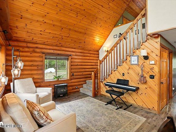 Beautifully maintained scribed log home on a private Chugiak lot. This 2-bed, 2-bath home features an open layout, updated kitchen with granite counters, and a spacious loft ideal for guests, office, or second living space. Oversized primary suite with walk-in closet. Recent upgrades include new septic, LVP flooring, and tile in the primary bath. Partially fenced yard with chicken coop, small...barn, and a large detached shop with power. Bright interior with large windows and peaceful surroundings