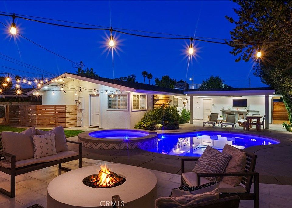 But the true magic awaits outdoors — a private backyard retreat complete with a newly renovated pool and spa, custom patio cover, outdoor bar, fire pit, and organic garden boxes. Lush landscaping provides the perfect backdrop for both relaxation and entertaining, offering serenity and privacy in every corner