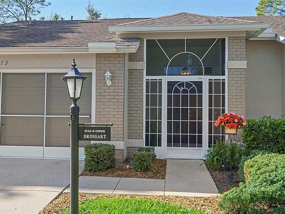 PENDING Look NO FURTHER! This impeccably maintained, end unit, expanded Oakmont villa in AWARD WINNING TIMBER PINES will sell QUICKLY. This home is beautiful with designer touches and being sold completely FURNISHED, TURNKEY. The welcoming screen enclosed front porch provides additional relaxing area for your retirement enjoyment. Through the double door entry you will feel like you are walking into ''House Beautiful'' This open concept, light and bright villa is perfect for entertaining. The lanai has been raised for safety, style and comfort. The well designed kitchen opens to lanai and has a nook to sit and enjoy the outdoors. Master bedroom , with new carpet, has two generously sized walk in closets, dual sinks and step in shower. Guest Bedroom has a huge walk in closet for always needed additional storage. The guest bath has tub/shower combo. The garage has a new garage door opener. Village maintenance fee includes termite protection as well as exterior maintenance. This is a one dog friendly village. Timber Pines is a 55+ Gated, Golfing Community with amenities galore. Country Club, Restaurant, 4 pristine Golf courses, Pickle Ball, Tennis, Physical Fitness Center, Billiards, Performing Arts Center, Crafts, Billiards, over100 Clubs and so much more. HOA includes Spectrum High Speed Internet and TWO cable boxes.
