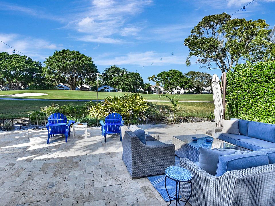 This retreat in the village of Cedar Cay blends its architectural appeal with modern luxuries. Relish an abundance of natural light and gourmet eit in kitchen with all white cabinets, white quartz countertops, premium appliances, and plentiful custom white lacquer cabinetry. Home has been renovated and redesigned with smooth walls and ceilings ,recessed lighting and travertine tile floors. These attributes create a sanctuary where every moment is framed by the stunning beauty of the golf course. The Living areas and The primary bedroom have direct access to the oversized back patio all facing to this golf course. There are 2 additional bedrooms 1 which is currently utilized as den/TV room and a second full renovated bathroom. This is a ''jewel box ''of a home ready to move in. 2 car garag New AC 2024