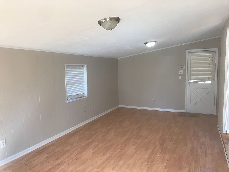 A split level house with 2 bedrooms and one bath on the top floor. The kitchen, den, and a front room on the main floor. The bottom floor has a bedroom, bathroom and a small den or office. And an unfinished basement with a washer and dryer.