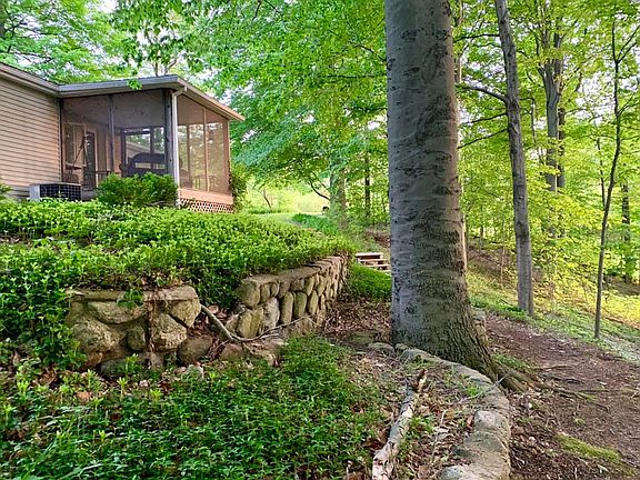 If you are looking for your own private paradise look no further. This home has been lovingly cared for and sits on top of 5 beautiful wooded acres. Beautiful views from every area. This home is perfect for anyone who loves to bird watch, hunt, mushroom hunt, owns a business, works on cars or just enjoys the seclusion this property offers. You are just minutes to shops and dining as well as toll road or bypass but nestled in your own quiet paradise. Detached 2 car garage as well as attached extended 1 car garage with floor drains and is plumbed for generator. Deck on front of home overlooking property as well as Sunroom on side of home are great places to sit out and enjoy each day. This home offers just under 1500 square feet on the main level with 3 bedrooms and 2 full baths. Hardwood flooring is in living room, bedrooms, dining room and is under carpet in hallways. Large kitchen with eat in dining area, all appliances will stay. Lower level has 1/2 bathroom and laundry area as well as a large finished rec room which is used as a theatre room. Outside you will love all of the trails, firepit area, and all of the nature surrounding you. Do not miss your opportunity to view this home.