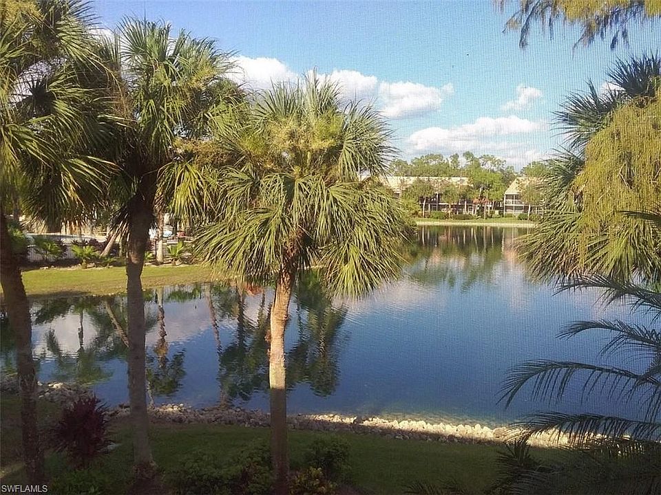End unit on the 2nd floor overlooking the lake is ready for a new owner. Fantastic view, close to the pool and clubhouse. One of the LARGEST pools in southwest Florida - 400 thousand gallons of crystal clear water with comfortable lounges, chairs, umbrella tables and Tiki Huts to meet the needs of all sun worshipers. Landscaped with lush tropical foliage surrounding its outer perimeters. It truly is breathtaking! A large elegantly decorated club house which includes a dance floor, library, kitchen, relaxing conversation areas, and a big screen TV · A large upper deck that overlooks the spectacular pool - a wonderful place to meet friends and just relax on a warm afternoon or evening · Daily, weekly, monthly activities - bridge, bingo, Mah Jongg, poker, water aerobics, walk away the pounds to music, happy hours, men and ladies luncheons, theater events, casino trips, special holiday functions, bocce ball tournaments, Dip and Dog barbeque, poolside functions with live music, Falling Waters Bowling League, dominos, fashion shows, and various concerts · Lighted manicured clay tennis and bocce ball courts, shuffleboard, and a putting green. East exposure and electric hurricane shutters.