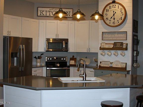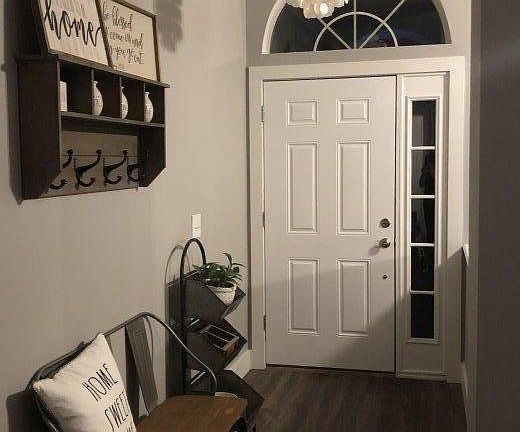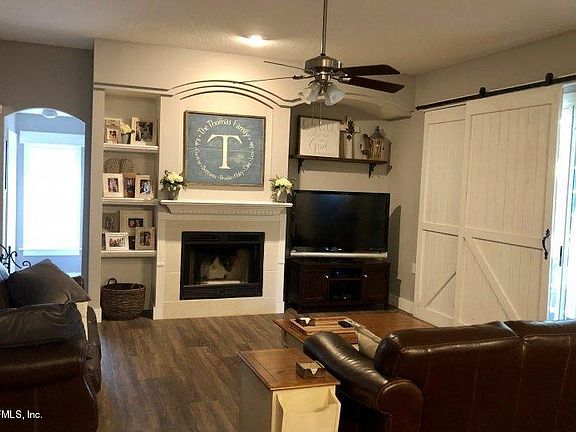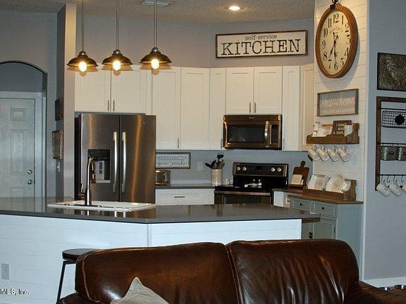Gorgeous move-in ready 4/3 single floor home with split bedroom floor plan on a quiet street in one of Jacksonville, Florida's premier residential communities - Eagle Harbor on Fleming Island. This home features: - over 2400 sq ft of living space, EVP flooring throughout the home (except two bathrooms have brick herringbone floor tile), 5 1/2 base boards, farmhouse trimmed windows - a huge 3 car garage with cabinet storage - open kitchen layout with Whirlpool stainless steel appliances, dual oven shaker cabinets with soft close drawers/ doors, Kohler cast iron sink, pendant lighting, gray quartz countertops, California island with shiplap base, shiplap focal wall, coffee bar nook with butcher block top - spacious family room has high ceilings with wood burning fireplace.