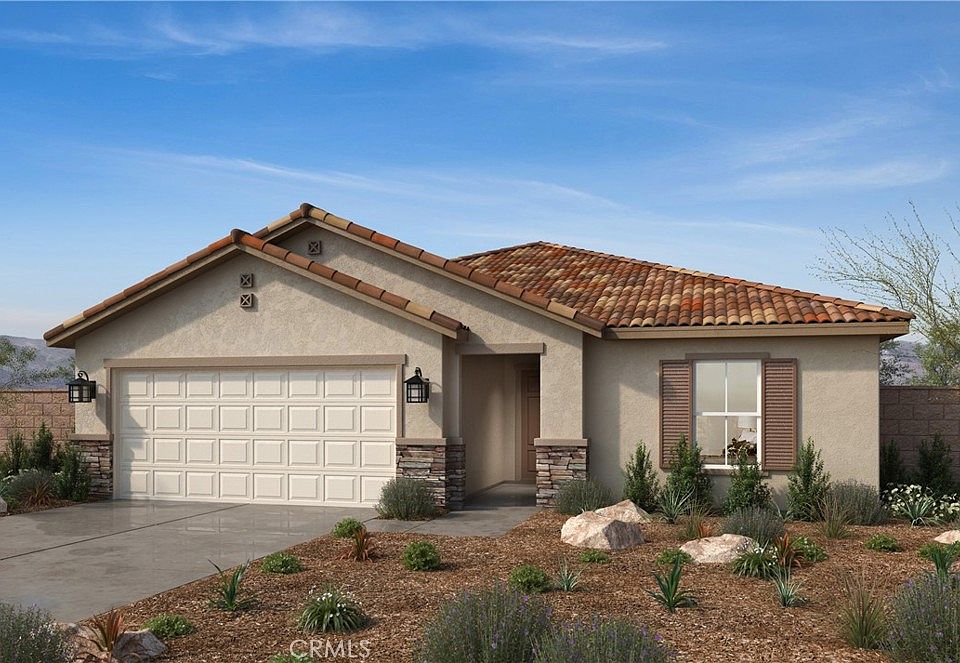Brand-new single-story neighborhood by KB Home-Cielo at Nuevo Meadows in Nuevo. This home features 3 bedrooms, 2 baths and 2 car garage. Large great room opens up to a nice sized kitchen with white thermofoil cabinets and white quartz countertops. Energy star qualified home to help save on your future energy bills. Sunpower solar system. All electric community. Convenient access to I-215. Future community amenities are parks and walking trails. Photo is a rendering of the model. Buyer can either lease or purchase the Solar.
