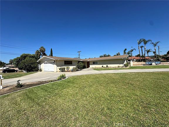 Beautifully maintained single-story corner lot home in Grand Terrace, has excellent curb appeal with palm trees, rose bushes, and a spacious circular driveway. Has a detached two-car garage with a laundry room, garage has been split in half and used as a room. There is a covered breezeway between the home and garage—perfect for gatherings, relaxing, or entertaining. RV owners will appreciate the separate gated side driveway with RV parking, a built-in RV dump station, and an additional covered carport with a roll-up door for extra storage or vehicles. 3 bedrooms, 2 baths, all bedrooms have ceiling fans and mirrored closet doors. The spacious kitchen has ample cabinet space, tile flooring, and stainless-steel appliances (included with the sale). A separate dining area flows into the cozy living room, highlighted by a fireplace and window shutter blinds. Central air conditioning and heating. There is a detached storage shed in the backyard, interior is drywalled and has a 1/4 bath (toilet). Conveniently located near shopping centers, parks, schools, and freeway access. Will not disappoint!