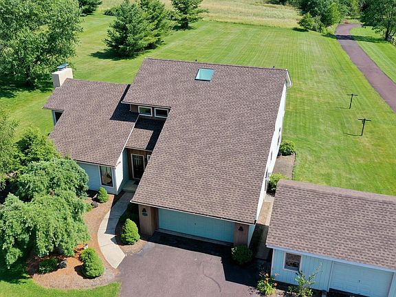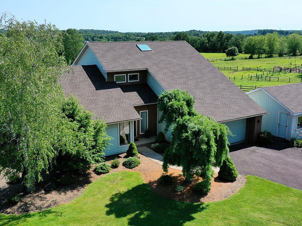 This very well-maintained contemporary style home is situated on 1 acre of picturesque land. With 2,350 sq ft of gracious living space this home includes 3 bedrooms, 2 full baths, an attached 2-car garage and another detached garage used for storage. Enter the tiled foyer with closet and you have direct sightlines to the living, family and dining rooms. The front living room has a vaulted ceiling and potential to be a first floor bedroom or a study. Flow into the family room with a dramatic cathedral ceiling and decorative wood beams, a beautiful floor to ceiling stone fireplace (propane heat), double door glass sliders lead to the outdoor covered patio to sit and enjoy the rolling hill views. Step up, through the french doors into the hallway where you will find the first floor full bathroom, and the quaint and tidy dining room with a french door leading to the outside covered patio. The kitchen is bright and cheery with a nice quality cabinet and center island with new range. The kitchen dining area has tranquil farm views and a french door with steps down to the yard. Down the hall is a generous sized laundry room with storage, a utility sink, and included washer and dryer. Pass the garage entrance and then up the two-story staircase illuminated from the large skylight! The master bedroom has a separate large sitting room (10 X 10) and views of the back landscape and could be converted into a fourth bedroom. Walk-thru the tidy walk-in closet (with closet organizers) and into the large bathroom with soaking tub, shower, and double sink vanity. Two additional bedrooms complete the upstairs. The basement includes several rooms that could be finished or kept for storage. The property is 1.1 acres of open land with spectacular field and farm views! With a new roof 2018, newer hot water heater 2015, new flooring (in kitchen, laundry room and hallway to the garage), broad trim and moldings throughout the first floor, and accent recessed lights throughout, this is a very clean and tidy home with neutral d~cor in a convenient and peaceful setting. Located 2.5 miles to the Quakertown Turnpike entrance, 2.1 miles to Wawa/Dunkin Donuts, and 3.2 miles to local shopping and restaurants.