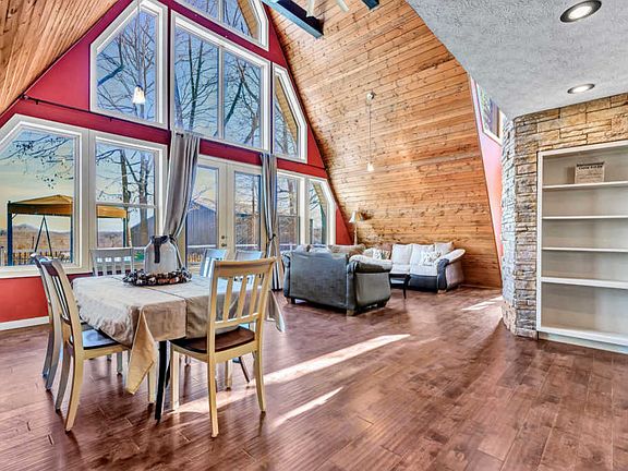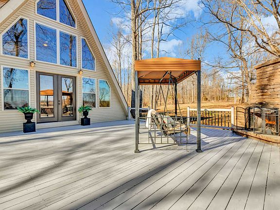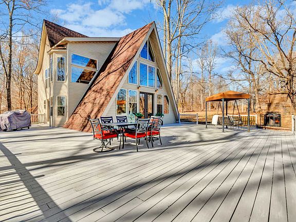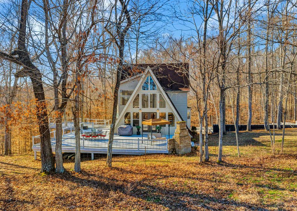 A-Frame Chalet, 5+ acre retreat features walking trail, RV 30 amp & septic hookups/parking-20 mins to Barren River St Park. Primary bathroom features new walk-in shower & leathered granite + New carpet. 4 bedrooms + loft/office. Updated kitchen with custom cabinets, SS appliances, beverage cooler, new dishwasher, & granite. New decks. Outdoor stone fireplace & more. Nearby Long C Trails for horseback riding & more. Spring fed creek. 80 gallon water heater. New driveway & retaining wall.