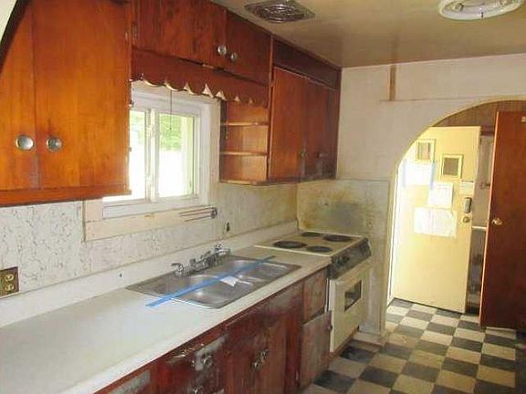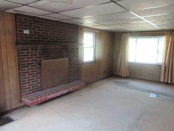Buit in 1944, this ranch style proeprty features two bedrooms and one bath with two car detached garage and full, unfinished basement. Front covered patio. Living room with brick fireplace. Kitchen wtih access to separate diniing area. Laundry room located in basement. Possible mold. Damaged roof. Cracked foundation in garage.