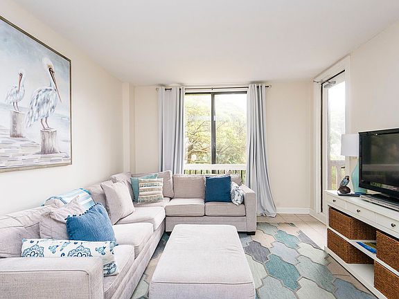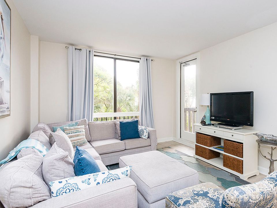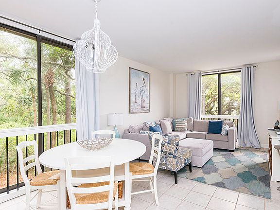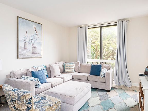 The seaside villa at 2275 Shipwatch Road showcases stunning views of the Atlantic Ocean from wide balconies and floor-to-ceiling windows. It's also exceptionally well located. Not only is the Island's boardwalk no. 6 literally just outside the door, making Kiawah's pristine beach yours any time day or night, this well-constructed villa is just a one-minute stroll to the coming world-class amenities of West Beach Village. The Gary Player-designed Cougar Point golf course is a three-minute walk, the Sandcastle with its broad verandas and pools is five minutes down the beach, and the boutiques and eateries of Freshfields Village is within a twelve-minute bicycle ride along beautifully landscaped paths, the Kiawah River, and tranquil tidal marshes. Inside, a light-filled great room opens up just a turn beyond the foyer. The walls are pale, the neutral-toned ceramic tile is cool underfoot, and the furnishings are comfortable and inviting in hues of water, sand, and sky. Floor-to-ceiling windows frame the views in both the living and dining areas, and a glass door opens to the first sundeck. The clean white kitchen opens to the dining area and offers solid-surface countertops, a tile backsplash in neutral colors, a pantry for extra storage, and a pass-through enabling conversations with the home chef over a cold piña colada. The first bedroom has been set up as the master suite, with a king bed, its own bath with tub, and a wall of floor-to-ceiling glass doors opening to the cedar-shingled sundeck. The second bedroom comfortably sleeps four in white-painted bunks and also enjoys glass doors leading to its own sundeck as well as its own bath. Additional features of this fully furnished villa include a community laundry area and convenient elevator access.