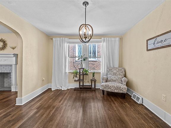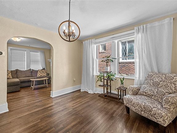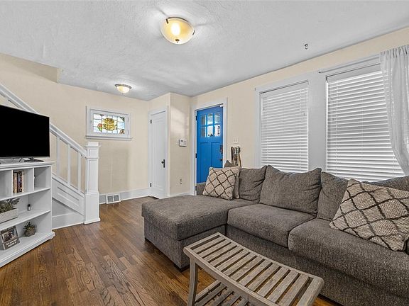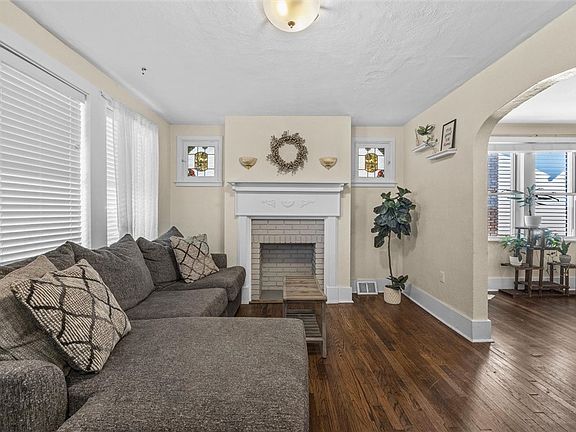 This charming home is ready for new owners! From the welcoming covered front porch enter into the living room with light and bright paint, a decorative fireplace, original stained glass windows, and hardwood floors that flow into the formal dining room. The equipped kitchen features granite counters, tile floors, and white cabinetry. A full bath completes the main level. Upstairs you will find a spacious main bedroom with double closets and access to a walk-up attic, the second bedroom, and another full bath. The partially finished lower level has plenty of storage space, the laundry, a half bath, and access to the fenced-in backyard. Custom blinds are also included! Located across the street from Phillips playground, with easy access to downtown, public transportation, and more.