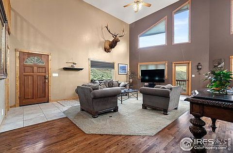 Breathtaking mountain views! Unique cabin style home in the rocky foothills of Lyons situated on over 35 acres of moss rock laced beauty, yet only 10 minutes from restaurants in Lyons! This 4 bed 4 bath has a cozy feel with wood floors, open floor plan, newly remodeled kitchen & master bath, & natural wood trim. You'll love the finished walk-out basement with custom bar. Multiple deck & patio locations around the home provide the perfect place to unwind & gaze at Colorado's beauty.
