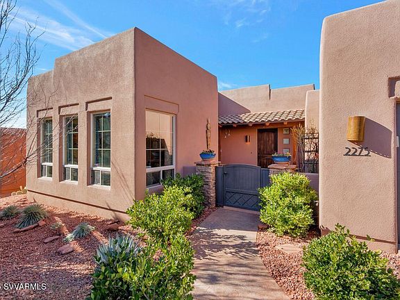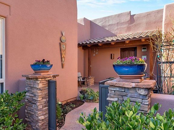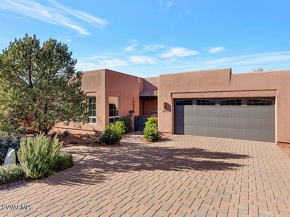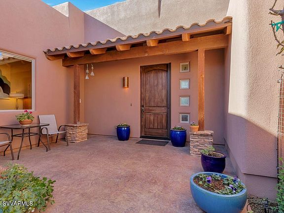 Experience an exquisite blend of modern elegance and classic Santa Fe style in this stunning three bedroom, two bathroom home tucked away in the heart of West Sedona. Ideally located near top-rated restaurants and trailheads, this property offers both convenience and tranquility. The open-concept layout features beautiful tumbled travertine tile floors throughout, accented by carpeting in the bedrooms, which was replaced just four years ago. The split floor plan ensures privacy, with the ensuite primary suite offering a serene retreat on one side of the home, while the second and third bedrooms, along with the secondary bathroom, are situated on the opposite side. The kitchen is a standout feature, boasting new stainless steel appliances, a dual-zone wine fridge and ... ... charming accent tiles that infuse the space with artistic character. The open living room is a welcoming space centered around a cozy fireplace. Floor-to-ceiling windows frame stunning or breathtaking views of Thunder Mountain, elevating the home's tranquil ambiance. Outdoor living is equally remarkable. Enter through a gated entrance into a spacious, secluded front patio that exudes Southwest charm. This versatile space is perfect for savoring a quiet morning coffee or hosting intimate gatherings. The private backyard, shaded by mature trees, offers a serene haven for birds and nature lovers alike. A louvered pergola provides an adaptable outdoor retreat, ideal for gathering around a fire pit, reading or simply unwinding in the peaceful surroundings. This home epitomizes the best of Sedona living, blending low-maintenance comfort with privacy, natural beauty and proximity to the area's finest attractions.