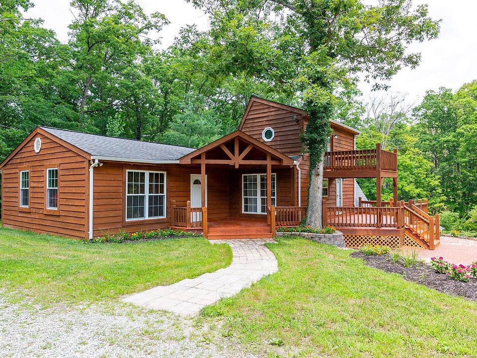 This gorgeous home is the perfect getaway with 2 stocked lakes, and beach pavilion! As a bonus, the home is set up with an in-law suite with it's own entrance, conventional heating and cooling system, and locks for a completely separate living space that would be perfect for potential rental income! The suite includes a kitchen, bedroom, living space, and bathroom! While the outside of the home is rustic and cozy, the inside is updated, bright, and airy. Large thermal windows let in tons of natural light and allows great views of your land. The main kitchen is updated with stainless steel appliances, white cabinetry, and granite countertop. The main floor is rounded out by two bedrooms and a spacious bathroom. The huge master bedroom takes up the finished upper level with a deck to overlook the serene trees for your morning coffee. Laundry is located on the finished, walk-out lower level. The main house has it's own geothermal heating and cooling system. Imagine yourself living here!