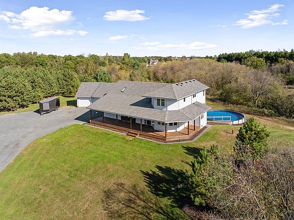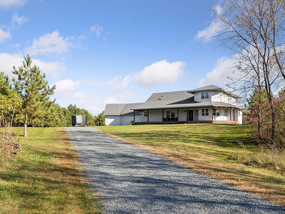 Stunning 4-bedroom, 4-bath home nestled on 14 private acres near Pine Lake. This one-and-a-half-story, open-concept home offers inviting living spaces filled with natural light and modern finishes. The gourmet kitchen features granite countertops, stainless steel appliances, and a walk-in pantry, flowing seamlessly into the dining and living areas. A bright sunroom provides the perfect spot to relax and take in the scenic views. Step outside to enjoy the wraparound porch or entertain on the back deck overlooking the above-ground pool and hot tub. Updated landscaping enhances the serene setting. The detached, insulated, and heated 3-car garage with breezeway provides comfort and convenience year-round, while the large pole building offers plenty of room for storage, hobbies, or equipment. The lower level includes a spacious game room plumbed for a future wet bar or kitchenette, a large family room, and additional flex space ideal for an office, gym, or guest area. Surrounded by mature trees and peaceful countryside, this property combines privacy, comfort, and functionality in a beautiful natural setting just minutes from Pine Lake.
