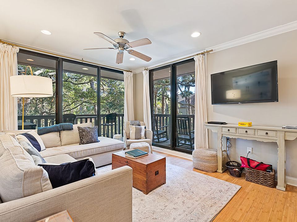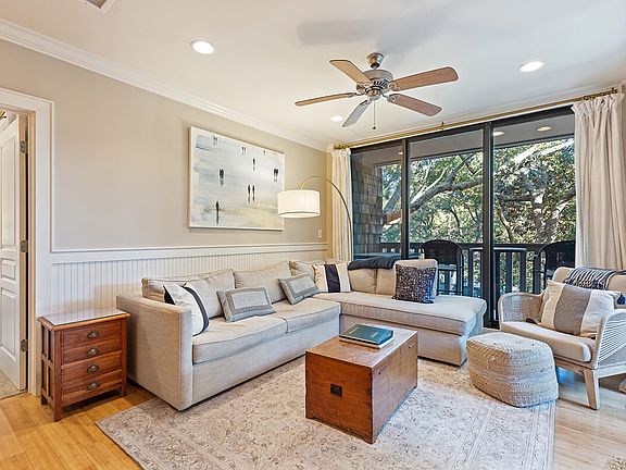 Situated within the revitalized West Beach Village, this fully appointed, two-bedroom, two-bath villa has easy access to the beach, West Beach Pool Complex, Cougar Point Golf course and clubhouse, The Sandcastle homeowner's pool. With newly renovated and upgraded interiors, this villa enjoys a quiet, end unit location overlooking a peaceful maritime forest. Open interiors flow freely between living and dining, and beadboard wainscoting adds coastal charm. Two sets of floor-to-ceiling glass doors open onto a covered porch from the living room expanding the space and brightening it with natural light. The renovated, galley-style kitchen has granite countertops, new cabinetry with glass paneled accents, and stainless appliances. Both bedrooms have wall-to-wall glass doors that open onto a private, covered porch. The master suite has a renovated bath, upgraded in 2021, with dual vanities, a soaking tub, and walk-in shower. The guest bedroom is generously sized and can accommodate two queen beds. Additional features include new carpet, fresh paint throughout, and a new hot water heater, all upgraded in 2021. An ideal rental property, this villa is offered fully furnished.