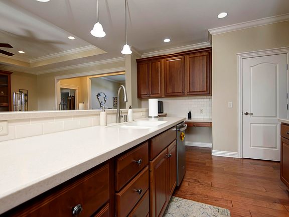 Wonderful, like new, all brick home in well located Overland Heights subdivision. Custom built on a spacious lot by Greg Off in 2016 with a fully landscaped yard, a covered patio and additional outdoor space with a Trex Composite deck. In 2020 the roof and gutters were replaced. This home has an open floor plan with spacious bedrooms, and the formal dining room has been converted into an office. Easy care home with wood and VCT tile flooring installed by Carpet Shoppe. The 3 car garage has a man door, large ceiling fan, utility sink and nice natural light and air flow with two large windows. A 10 x 10 concrete ventilated storm shelter with a fire proof steel door is part of the original build, and is a separate room accessed through the rear of the garage. The attached shelving and wall mounted organizers in the garage will convey as well as the 5 year old washer/dryer. The refrigerator in the kitchen does not convey, but the refrigerator in the garage does as it was part of the original appliance package.