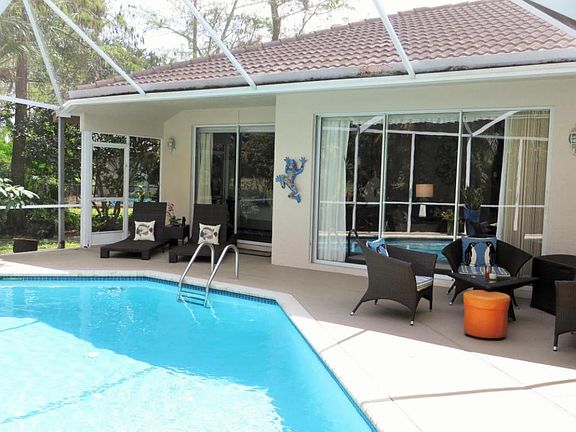 Secluded Tropical Paradise! The home sits way back off of the street on an oversized private lot. This gorgeous home has a fantastic remodeled kitchen with high end stainless steel appliances, Viking Stove & Quartz counter tops. Wonderful open floor plan with vaulted ceilings, gorgeous hard wood floors thru - out. Next to the Kitchen is a cozy breakfast area and family room that opens to the pool. Master bedroom has twin walk-in closets and a large bathroom with walk-in shower + oversized soaking tub. Out back is a tropical paradise with lush landscaping, large covered outside living areas + the pool is screened for low maintenance. Home is designer decorated and furnishings are negotiable.