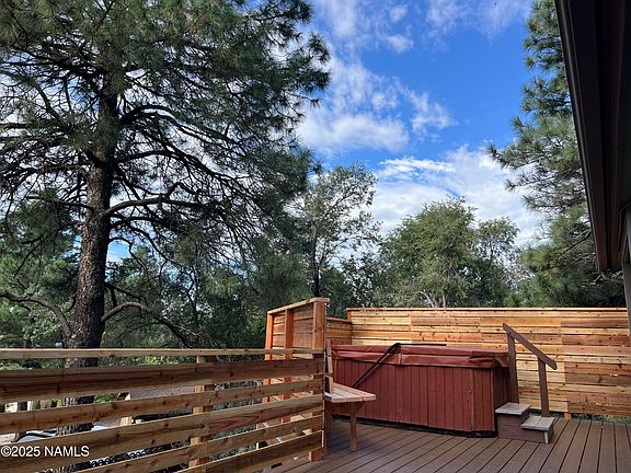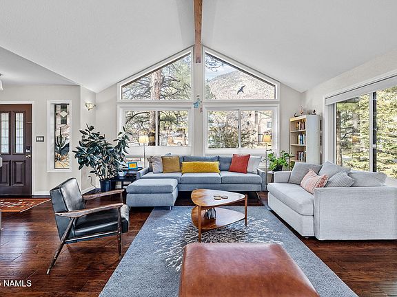 Fully Furnished & Updated Flagstaff Retreat! Move-in ready and completely updated, this stunning 4-bedroom, 2.5-bath home offers the perfect blend of comfort and style. The fabulous great room features cathedral ceilings, a cozy stone fireplace, and floor-to-ceiling windows that flood the space with natural light. The spacious kitchen boasts maple cabinetry, stainless steel appliances, and a breakfast bar for casual dining.The walkout basement provides an additional entertainment or fitness area, complete with a wood stove for extra warmth. Retreat to the large primary suite on main level, where a charming barn door leads to a spa-like bathroom with a walk-in shower and dual vanity.Enjoy the outdoor jacuzzi on the open patio with treed views.