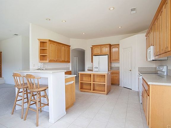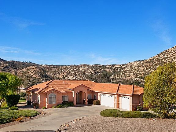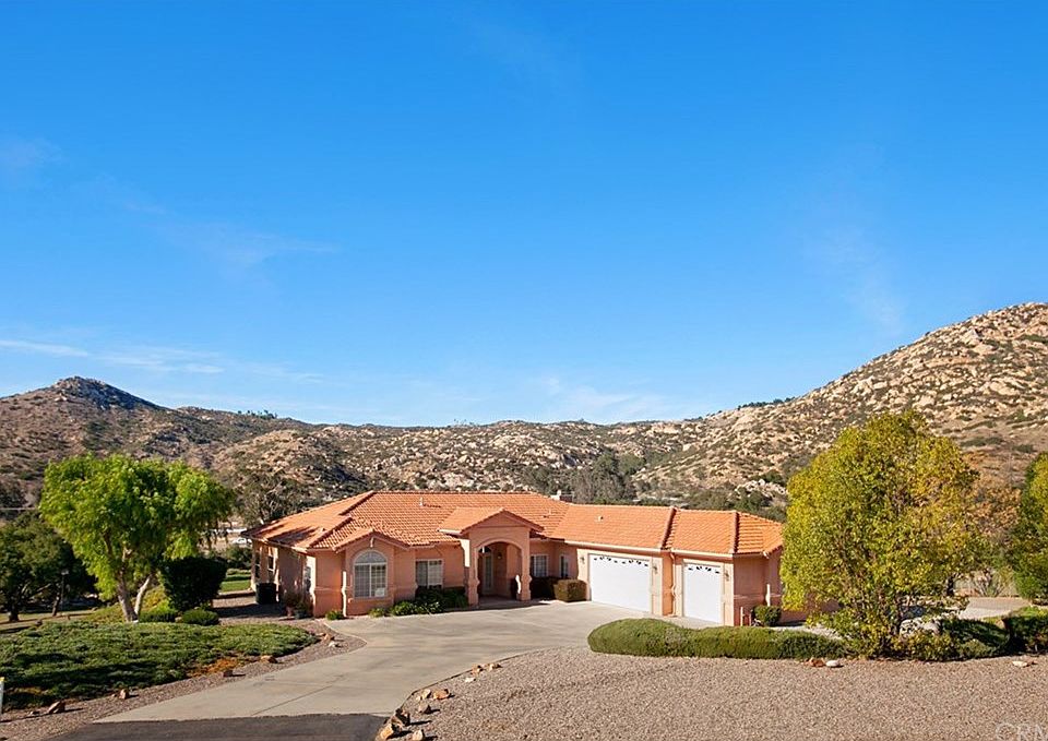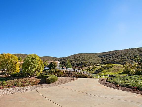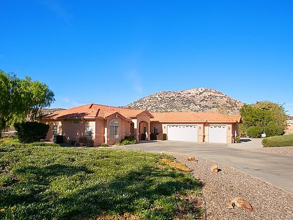 Beautiful Mediterranean architecture greets you as you stand in awe of the views of the hills on all sides. This spacious cul-de-sac home is surrounded by manicured landscape, citrus and fruit trees. The 3+ acre exceptional parcel backs to open space for privacy and enjoyment of nature. Enter the home and take in the spacious feeling that high ceilings in all rooms provide. Entertainer's kitchen has an island, a breakfast bar with room for 4 chairs and a walk-in pantry. Expansive counter tops are solid surface. Laundry room has plenty of cabinets. Hanging space and folding counter make laundry a snap! Huge master bedroom with huge master bath has two closets, one is a walk-in closet. Master bath features dual vanities, jetted deep tub and smooth walled shower. 3 car garage has cabinets for storage or workshop. Enjoy the view while you relax on the open lattice covered back patio. Backyard is complete with an RV pad with water and electric hookups, shade, citrus and fruit trees. Plenty of room for your horse, too! Property has a well that is used for most of the irrigation needs. Brand new HVAC was installed in 2015 and new water heater in 2016. Appliances included are the refrigerator with ice maker, smooth top electric range, microwave, dishwasher, as well as washer and dryer in the separate laundry room. The home has Reverse Osmosis water dispenser at kitchen sink and a whole house soft water system. This property is priced to sell!
