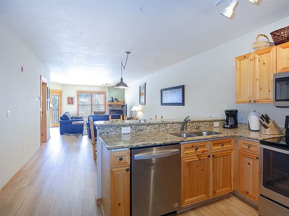 This stunning two bedroom/ two bath, fully furnished Tenderfoot Lodge faces South with Keystone ski area views. Cross over the Snake River on a bridge for an easy walk to the slopes. Located on the Snake River you have a a trifecta of sun, views and water. You can watch the skiers from your deck. There are recent updates to all flooring with LVP flooring in the Living area. Living Room is an inviting space with a gas fireplace which includes a pull out sofa and pull out loveseat that makes into a single bed. This property is fully furnished with an owner's closet in the unit and ski storage to the right of the front door. Kitchen has granite countertops and stainless appliances. Primary bedroom is ensuite with a king bed and full private bathroom. Second bedroom has a bunkbed with a double on the bottom and a single on top. Tenderfoot Lodge offers two elevators for easy access from the heated garage below the building. There are four electric vehicle charging stations in the garage. Nice sized deck has sturdy log furniture with a private grill and all day sun and views. Building amenities include a spacious central lobby to meet with other owners or friends, or to simply read a book by the fireplace. There are two large outdoor spas, large outdoor grilling area if you do not want to use your deck grill. This unit has a current rental contract with Summit Cove Lodging, an established, well regarded Property Management company that the Sellers have loved working with. You are allowed to rent this property short term. This special offering is within walking distance to everything... shops, restaurants, hiking, mountain biking, and skiing. River Run Village is nearby. Tenderfoot Lodge is managed by Summit Resort Group and they do a great job. There is NO transfer tax or resort fee at this great condominium complex.