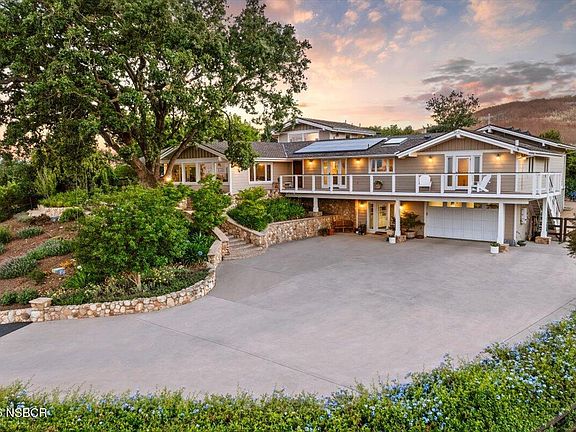 Set atop a picturesque hill and framed by vineyards and orchards, this peaceful Santa Ynez Valley ranch captures sweeping mountain and valley views within the highly sought-after Ballard School District. Spanning approximately five acres behind private entry gates, the property's centerpiece is a beautifully remodeled residence that blends timeless ranch charm with elevated modern comfort. The main home offers four bedrooms plus an office and three-and-a-half bathrooms, complemented by a separately accessed fifth bedroom with full bath--ideal as a guest retreat, gym, library, or au pair suite. Thoughtfully updated throughout, the home features wide-plank French oak flooring, beamed ceilings, limestone fireplaces, newer windows and doors, and refined, high-quality finishes at every turn. The expansive living room showcases breathtaking 180-degree views across rolling hills to iconic Figueroa Mountain and opens seamlessly to a serene covered porch and lush, manicured gardens beyond. At the heart of the home, the remodeled kitchen is both striking and functional, with honed granite countertops, a custom statement island, professional Viking range, coffee bar, and an additional beverage refrigerator--perfect for both everyday living and entertaining. The flowing floor plan offers multiple inviting living spaces with effortless access to outdoor decks, dining patios, and garden areas. The primary suite features vaulted ceilings, dual closets, a beautifully remodeled bath, and an adjacent flex space currently used as an office. A separate guest wing includes two bedrooms with a dual-entry bath, a generous laundry and mudroom, powder room, and an additional upstairs bedroom-and-bath suite.Designed with the casual equestrian in mind, the property includes a barn, four stalls, lighted arena, two horse corrals, and a charming chicken coop. Majestic heritage oaks, mature fruit trees, and vibrant gardens enhance the natural beauty of the setting, while owned solar panels and a four-car garage with electric vehicle charging add modern convenience. Ideally located just minutes from Los Olivos, Ballard, and the heart of Santa Ynez Valley wine country, this exceptional ranch offers privacy, beauty, and an enviable lifestyle in one of the region's most coveted locations.