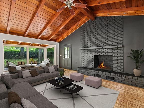 Tucked away off the road in a serene wooded setting with mature trees, this home offers bright, open living spaces! The work has been started, but it is now ready for you to finish out as your dream home. Wood floors flow throughout the main level, where the living room impresses with soaring vaulted and beamed ceilings, a dramatic floor-to-ceiling brick fireplace, and walls of windows flooding the space with natural light. The kitchen boasts sleek European-style cabinets, stainless steel appliances, an oversized stainless apron-front sink, and a bright dining room. A second living room offers abundant natural light and another cozy fireplace. The oversized primary suite features dual closets, a reading nook, and an updated en-suite bath with a fully tiled walk-in shower. Two spacious secondary bedrooms and a full hall bath provide comfort for everyone. On the fully finished terrace level, you’ll find two expansive open living areas—ideal for a game room, media space, home office, craft room, or playroom—along with two bedrooms, a full bath, and a wet bar with space for a refrigerator. Recent updates include a new roof, HVAC, and water heater, ensuring peace of mind for years to come. Book your tour today!