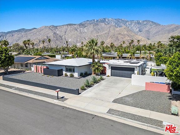 No HOA or Land Lease - you own the land! Owned $50K Solar system! Welcome to your desert sanctuary with amazing views of the San Jacinto mountains! This stunning completely upgraded and remodeled home offers a seamless blend of mid-century modern design and desert charm. This pristine home has just been updated with a new kitchen, bathrooms, custom interior paint, upgraded electrical, plumbing, a/c, solar, Tesla Powerwall and custom outdoor mural by renowned artist Alexander Peuchot! The open kitchen is a culinary haven, complete with stainless steel appliances and opens to the dining room and private pool area. Retreat to the luxurious master suite or unwind in the expansive outdoor oasis featuring a sparkling pool, BBQ area and amazing mountain views with no power lines! Nestled in the prime and tranquil Vista Norte neighborhood. This home is a successful vacation rental and Vista Norte is currently under the city's vacation rental cap. Perfect for your primary residence, second home or vacation rental. Schedule your showing today and experience desert living at its finest. Furniture available to purchase outside of escrow.