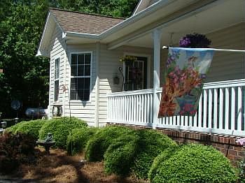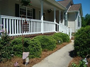 Beautifully maintained home! Spacious rooms throughout, den with vaulted ceiling, fireplace & gas logs, large kitchen with all appliances remaining including smooth top range, microwave & refrigerator, bay window dinette, master suite features vaulted ceiling, walk-in closet, garden tub, separate shower. Tons of nice landscaping. Rocking chair wraparound front porch.