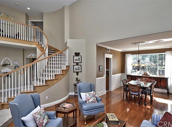 Wonderful Canyon Crest 5 bedroom plus office home located at the end of a single loaded Cul-De-Sac street in a guard gated community. Enter through the double door entry into this beautiful home with circular staircase, living room with high ceilings and formal dining room with wainscoting. In addition, on the main level there is a guest suite with direct access to the bathroom, a home office, spacious family room with fireplace and built-ins, a gourmet kitchen with center island, granite counters, walk-in pantry, stainless steel appliances, cozy breakfast nook and window over kitchen sink looking out to backyard. Upstairs there is a large master suite with fireplace, spacious master bath and huge walk-in closet, 3 additional bedrooms, two with a jack and Jill bathroom and one with its own private bath. The lovely backyard is beautifully landscaped with room for a pool. Features: Hardwood flooring, wainscoting, inside laundry room with sink, 2 fireplaces, 3 car garage and dual paned windows. The community amenities include: Pools, 4 tennis courts, clubhouse, billiard room, banquet facilities, playground, picnic area, sports court and fabulous gym. Located near Lake Mission Viejo offering boating, fishing, swimming and summer concerts. Low Tax Rate!