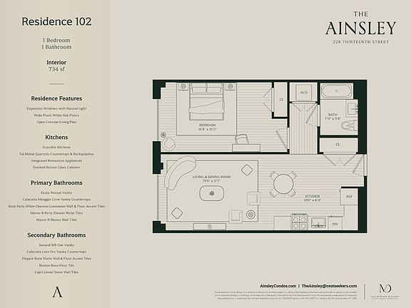 Introducing Garden A at The Ainsley, a beautifully appointed 1-bedroom, 1-bathroom home that blends modern sophistication with timeless charm. Spanning 734 square feet, this residence offers a spacious open-concept layout designed for luxurious urban living.