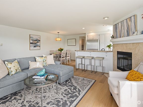Welcome to Sunset View Condominiums. This 4 unit boutique building is located in the heart of Edmonds, two blocks from Edmonds Beach & a quick walk to everything downtown Edmonds has to offer. This light filled, corner unit has partial sound and mountain views from every window. Fresh paint & new flooring throughout. The 970 sq ft lives large with this generous open floor plan. Enjoy the light filled living room with gas fireplace and sunny balcony. The primary bedroom boasts ensuite bath & walk-in closet with extra storage. In unit laundry with new washer and dryer, 2 oversized garage parking spaces, storage unit, and in unit storage, space is not an issue. Don't miss this rare find in Beautiful Downtown Edmonds!