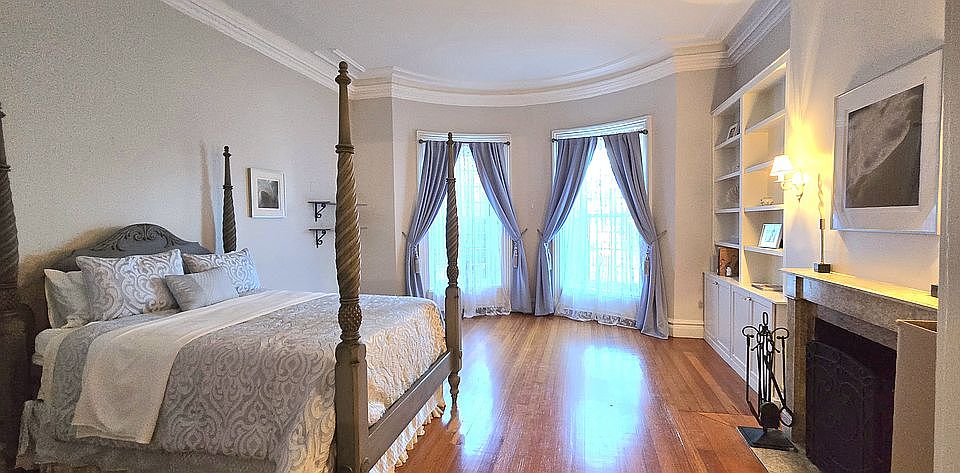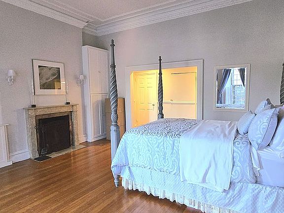Upstairs, the spacious primary suite impresses with 12-foot ceilings, a beautifully preserved fireplace, ornate trim, and oversized windows offering partial river views. Storage is plentiful with a walk-in closet, built-in shelving, multiple additional closets, and even an attic. The suite also includes a renovated full bathroom with a tub.