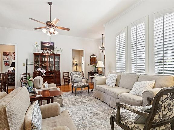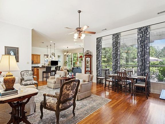 One wonderful story of almost maintenance free living! Enjoy a carefree lifestyle with a back patio view of the pond, 2 acres and stocked. Bright and natural light diffused with gorgeous plantation shutters. Living room is inviting with warm and pristine wood floors! 11,10 and 9 foot ceilings give a spacious feeling throughout the home. Gourmet kitchen has counter space for all the cooks! Primary suite has a lovely garden bath with separate shower and double the room for closets. Lawn maintenance and sprinkler system maintained by the association. Community pool is just down the street for summertime fun and relaxation. A home much younger than its years!