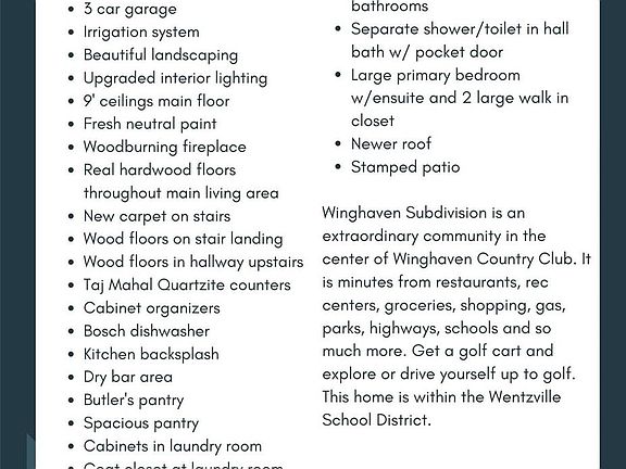 Upgraded Winghaven home! Awes you at the curb and feast your eyes on all the upgrades inside. Gorgeous real hardwood floors throughout. Fresh paint to polish off all of the upgraded lighting. The wood burning fp is the perfect focal point for a spot to gather at the bar. Kitchen is a dream with the Taj Mahal Quartzite counters, adorning backsplash to add texture, bosch dishwasher, again with the gorgeous lighting, and you cannot miss all of the cabinet organizers/storage space this home offers. The butlers pantry is bonus storage as well as a serving spot for that dinner party. Outdoors you will find a gorgeous patio, landscape and an inground sprinkler to keep it all thriving. A very spacious upstairs w/ 4bedrooms, bathroom w/ separate toilet/shower and a large primary suite w/ensuite and large closets. There is also a bonus room finished in the basement for an office/media room. Winghaven Country club a block away, close to restaurants, shops, groceries, recreation & more!