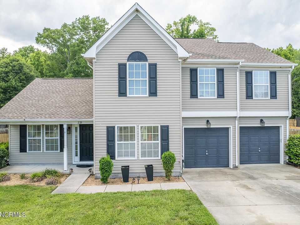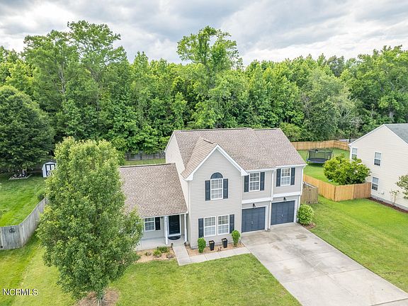Welcome Home to this charming transitional in Moyock's premier golfing neighborhood of Eagle Creek! Enjoy the close proximity to the Golf club and grill while maintaining a wooded and serene backyard view. Enter into the inviting and open foyer to the large great room with vaulted ceilings and natural light. Off the foyer is the flex room which can be used as formal dining, play room, office, or anything else you can dream up. Kitchen is bright and inviting with painted white cabinets, recently laminated tops, island, newer LVP flooring, and updated appliances. Off kitchen is access to laundry hall where pantry, half bath, laundry and access to two-car garage is located. Access to backyard is also off kitchen. Backyard features paver patio, fire pit, shed, and neighboring trees to the rear. Upstairs you will find a large primary suite with dual closets, shower, tub, and dual sinks. Three large secondary bedrooms, hall bath, and linen space complete this floor. Don't wait!
