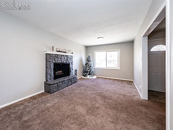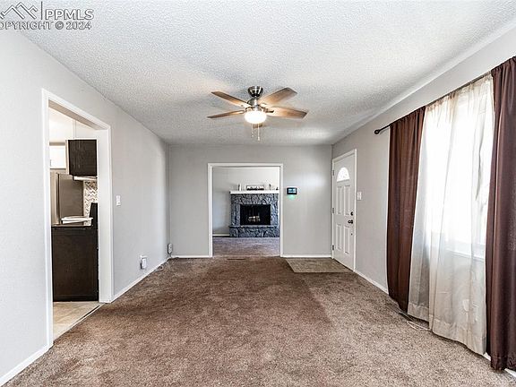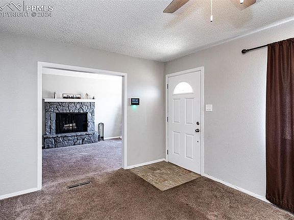 Charming remodeled rancher in established and quiet neighborhood. Fenced front yard with cute front porch and ample parking, including room for an RV. Step inside where you are greeted by a large living room space. Off the living room sits the family room which features a stone surround wood burning fireplace and great natural light. The eat-in kitchen has stainless appliances, custom tiled back-splash and newer cabinets. Off the kitchen sits a roomy laundry room with extra storage space. Make your way down the hall to find three good sized, well laid out bedrooms, each with a ceiling fan. The convenient updated hallway bathroom features a spacious walk in shower (plumbing exists to convert to a tub/shower combo if desired). Out back, enjoy the covered patio and fully fenced yard with great mountain views! The backyard also has a shed for extra storage and separate dog run. Home is walking distance to schools, a short distance to shopping and restaurants, and easy commute to military installations & I-25.