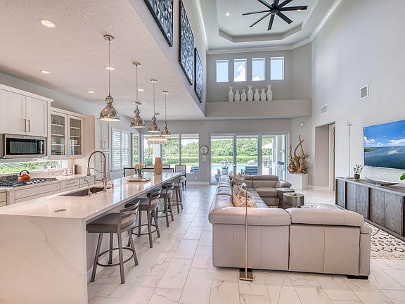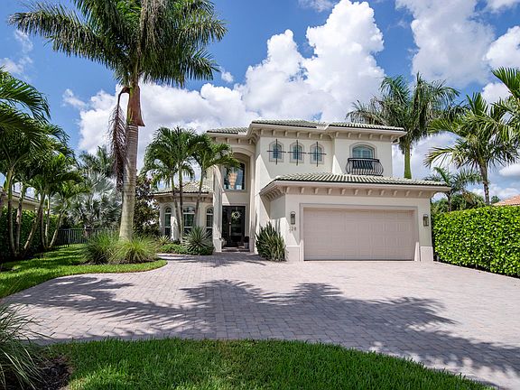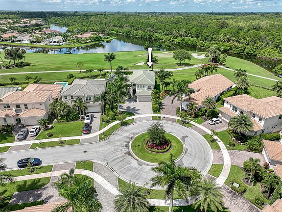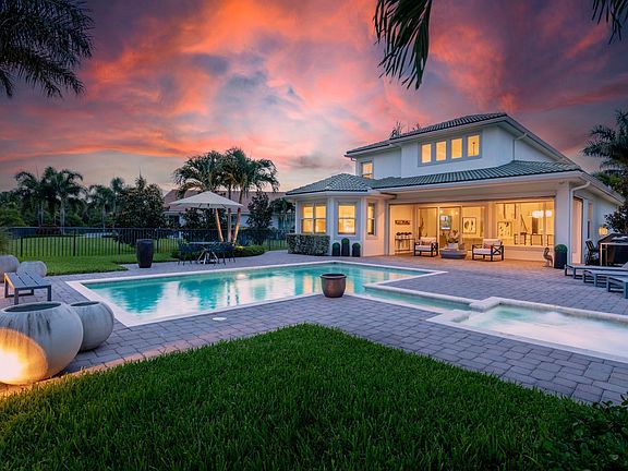 This exquisitely designed 2019-built home offers breathtaking lake, golf & preserve views from one of the best homesites in the resort style gated community of Jupiter Country Club. This rare Saviero model is one-of-a-kind and has 4 bedrooms, 4 baths plus a flex room/den. The prime cul-de-sac location within the community provides sweeping tree-lined views of Riverbend Park, the winding lake & the 11th green. Live comfortably in this energy efficient home with CBS construction, natural gas, reverse osmosis water filtration system in kitchen, and impact glass windows & doors throughout. The newly replaced custom impact glass front door and voluminous two story ceilings welcome you into the open concept great room with immediate backyard views through the wall to wall windows. Professionally designed & customized from top to bottom, this home exudes modern sophistication and provides all the essentials of easy Florida living. You will see the high quality finishes and attention to detail flow throughout the home. Stunning light fixtures are throughout the home. No standard finishes here! Rest peacefully in the primary retreat where the original floor plan was modified to encompass a downstairs guest room and transformed into the primary spa-like bath & expansive modern custom closet. Friends & family will gather at the kitchen's expansive center island featuring a waterfall quartz countertop & pendant lighting. Kitchen upgrades include gorgeous white solid wood cabinetry with glass panels, pull out shelving, tile backsplash, built-in refrigerator, 5 burner gas cooktop & double ovens. The flex room/office and a full bath are located downstairs. 3 guest bedrooms are upstairs-all bedrooms have walk-in closets with built-ins & 2 have ensuite baths. Step out through the great room's sliding glass doors into the outdoor oasis. Surrounded by mature palm trees and tropical landscaping, this area boasts a covered lanai, motorized retractable screens, a lovely pool & spa with a sunshelf and the most serene preserve, lake and golf course vistas. Sunsets are enchanting from this relaxing outdoor living space perfect for lounging & entertaining! This home can be purchased turnkey furnished including a golf cart. Jupiter Country Club is a luxury gated community conveniently located within close proximity of I-95 and the FL Turnpike, beaches, shopping, restaurants, parks & nature preserves. Club amenities & events offer a plethora of social opportunities and include a Greg Norman Signature golf course, 2 resort-style pools, the Sway restaurant & bar, a state-of-the-art fitness center + yoga/mat pilates/barre group fitness classes, massage/facial treatment services, tennis, bocce ball, pickle ball & basketball. Members enjoy reciprocal privileges to Invited Clubs worldwide. Live your best life here!