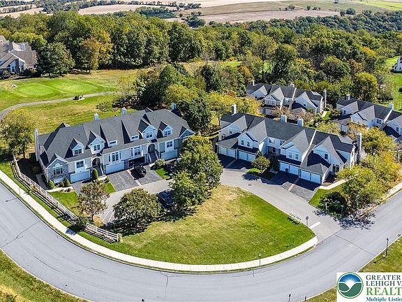 Welcome to 228 Merion Lane, where panoramic valley and golf course views set the tone for relaxed, elevated living. Nestled in the highly desirable Country Classics at Morgan Hill community, this pristine 3-bedroom, 2.5-bath townhome offers a refined blend of comfort, beauty, and convenience. Inside, natural light fills the spacious family room, featuring a gas fireplace and stunning views—perfect for cozy evenings or easy entertaining. The well-appointed kitchen boasts 42” cabinetry, gas cooking, a large pantry, kitchen island, newer backsplash, and under-cabinet lighting, granite counters—all designed for both everyday enjoyment and stylish hosting. The formal dining room transitions effortlessly to the newer maintenance-free deck, complete with an awning where you can savor breathtaking sunset views over the Lehigh Valley and golf course. Upstairs, the primary suite impresses with two walk-in closets and a grand bath, while two additional generous bedrooms share a beautifully appointed Jack-and-Jill bath. A convenient second-floor laundry adds ease to everyday living. The walk-out basement offers full daylight and a rough-in for a future bath—ready for your finishing touch, whether a fitness studio, media room, or guest retreat.