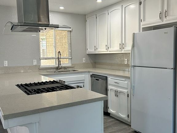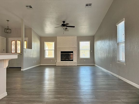 1437 sq. ft. Three bedroom, two bath house, newly renovated. Open kitchen with quartz counter tops and new stainless steel appliances. Faux wood flooring throughout the house and tile flooring in bathrooms. Living room has a brick fireplace. Bathrooms have new quartz counter tops, new vanity mirrors, and new toilets. Stand alone shower in master bathroom en suite. Indoor Laundry room. New sliding doors leading to covered patio with large backyard. Xeriscape front yard. Evaporative cooling and forced air heating. White refrigerator provided but not warrantied.