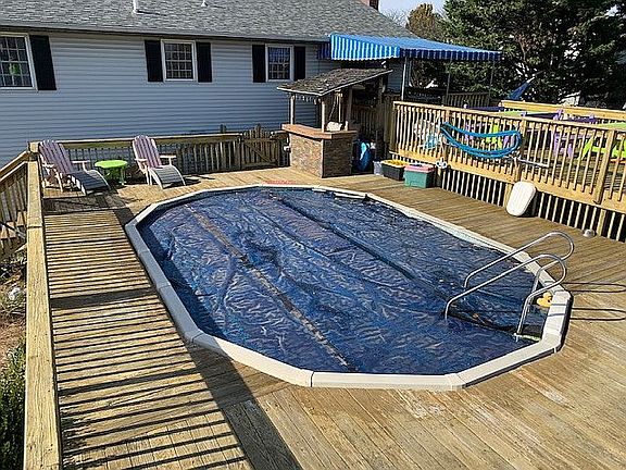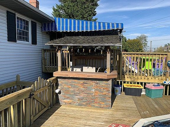 Above par bi-level; black kit-barn board floor! Large 3 tier deck w-awning. Above ground pool. Gardens, porch, pond.