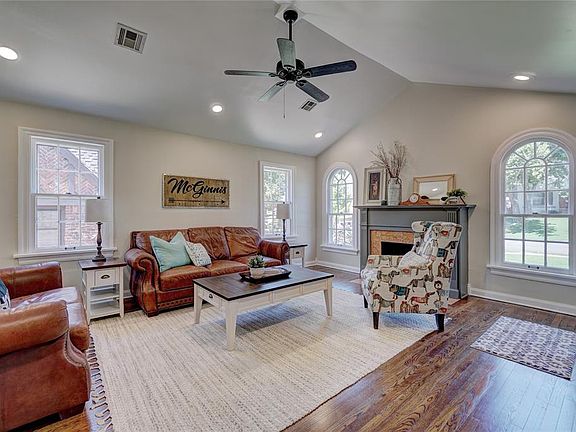 The lovely arched front door opens to gorgeous professionally restored hardwood floors. New paint throughout and windows, doors and trim have been completely refinished and new/updated hardware added. Vaulted living room with fireplace, recessed lighting and ceiling fan. Master bath has large his and her closets and deep pedestal cast iron tub. Upstairs bedroom/family room has large closet and bonus children’s nook.