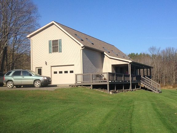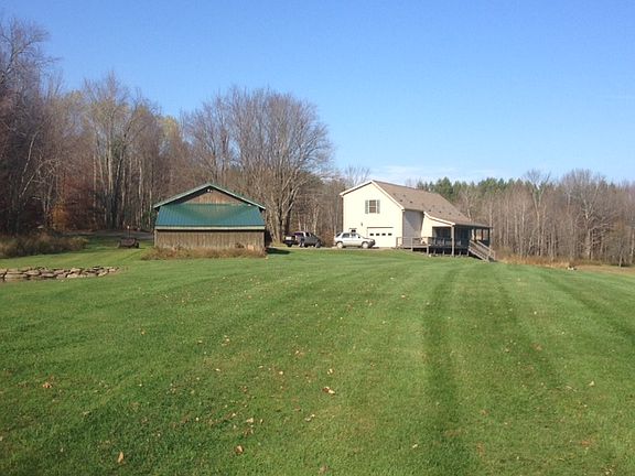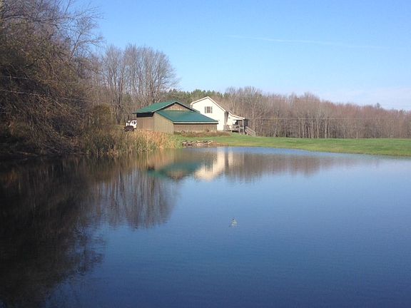 NEW PRICE, $10,000 REDUCTION! Peaceful, private, serene, inviting and comfortable are just a few words to describe this newer 4 + bedroom contemporary with an open floor plan with high ceilings with views you can only dream of. This very comfortable spacious home boasts a great feel of warmth while the windows and french doors give the feeling of the outside being with you. The large covered deck invites you to soak in the views both near and distant. Your yard is well manicured with 2 stocked ponds, one with a zip line for summer fun and great lawn area surrounded by trees/woods to add to your privacy. The children even have their own playhouse! The kitchen features stainless steel appliances and an in sink island, all open to the living area so you donââ,¬â„¢t miss out on what is going on either inside or out! On the main floor in addition to the kitchen with a large panty, dining area and living room, there is a large laundry room, large bedroom with a walk-in closet, full bath, plenty of additional closets and an office (or additional bedroom). The large covered deck gives room for plenty of outdoor living. On the second floor there is a balcony overlooking the main floor, views of the great outdoors, 3 bedrooms, full bath and a large bonus room that is currently used as a family room but could easily be another very large bedroom. There is a large single car attached garage with plenty of storage. The garage/barn has a woodshed, wood room with a wood furnace that heats the home with radiant heat and a workshop with garage space. This is a must see if you want a great home, hunting lodge, corporate retreat, B & B, event center or use your own imagine. The possibilities are endless!
