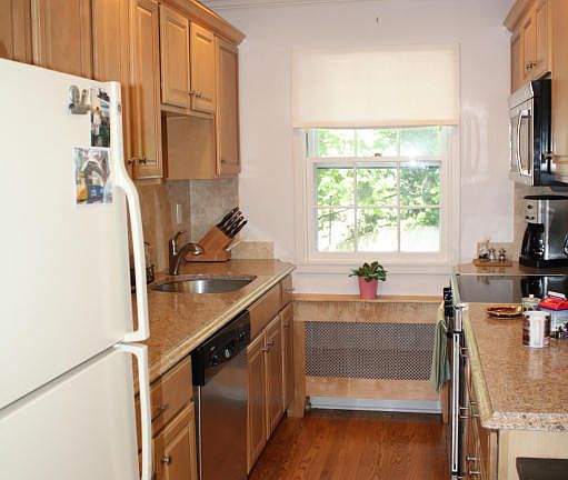 This perfectly located 2 bedroom, 1 bath condominium is across the street from Mead Park and a short walk from the train station and village. Totally renovated sparkling kitchen, newer bath, spacious living/dining room and easy access from your parking spot to one floor living. Low common charges include heat and hot water.